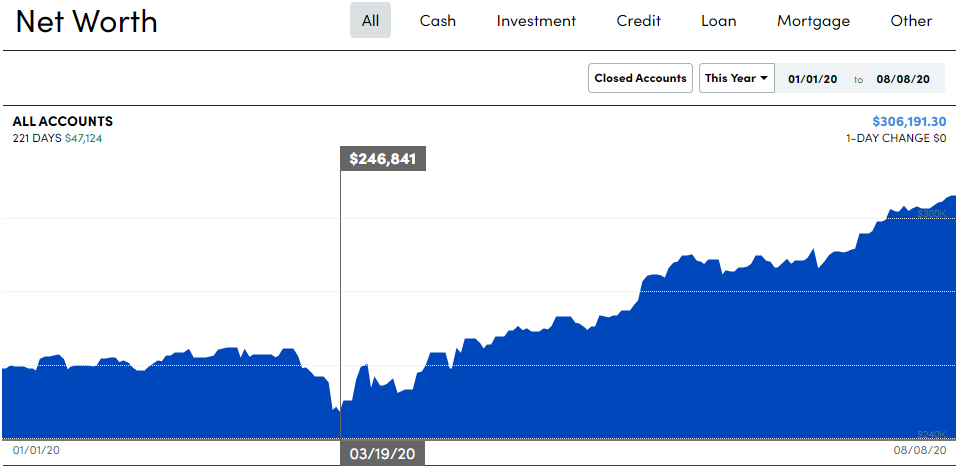 But 2020 hasn’t been a bummer year for our Net Worth! We paid off our second/final auto loan and committed to maxing out our retirement accounts at of the beginning of the year, before Coronavirus hit. We continued steadily saving through it all, even though I was furloughed for a few weeks. I had made myself extremely useful in a number of roles; not quite irreplaceable but close. This limited the number of weeks I had to take off unpaid compared to others. Continuing to buy during the massive 30% dip (3/19/20 below) meant that we saw great returns on the way up. We didn’t Dollar Cost Average per se (http://prudentcoin.com/dollar-cost-averaging-is-timing-the-market/), but invested like normal as soon as we had the cash.